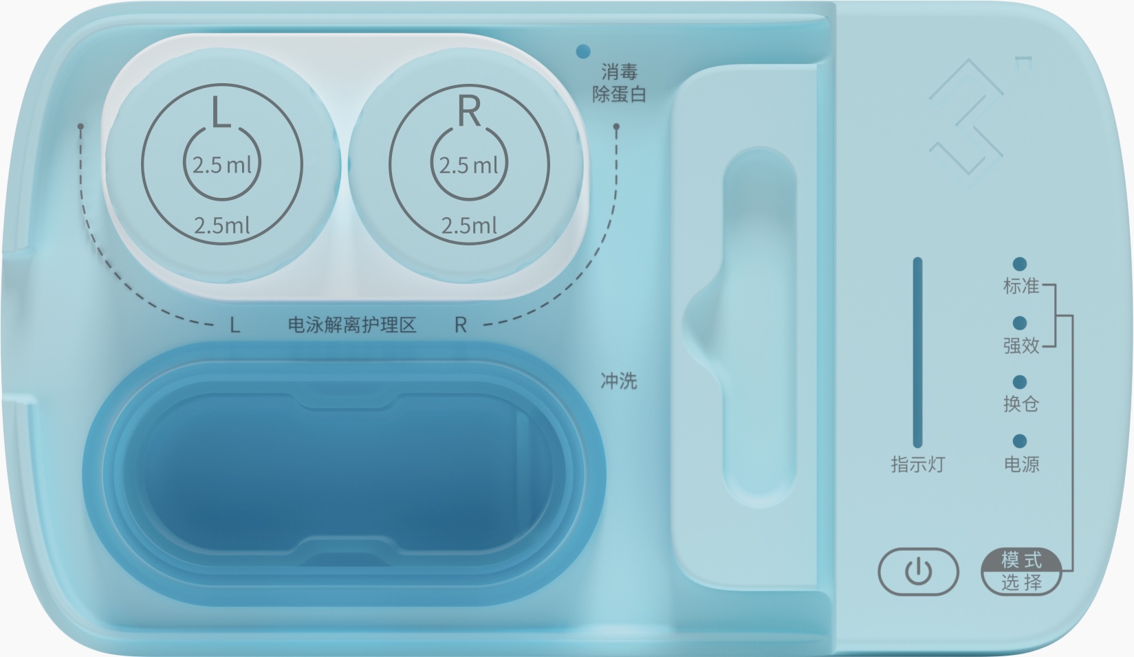 该仪器搭载全球首创专利技术——电泳解离Elepy®,在无损镜片性能、成分简单安全的同时,采用便捷的操作方式对镜片进行高效的杀菌消毒除蛋白。此外,还可96小时抑菌储存镜片、杀菌消毒吸棒等配件。
